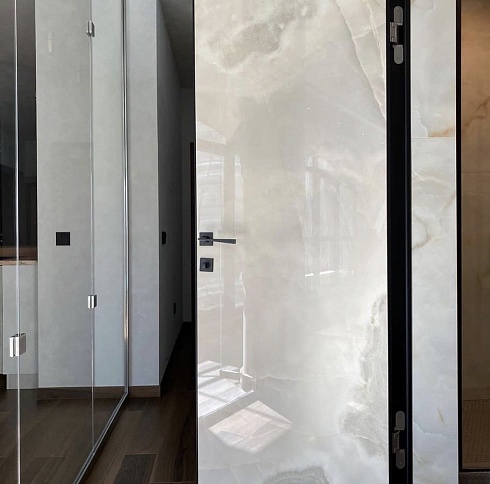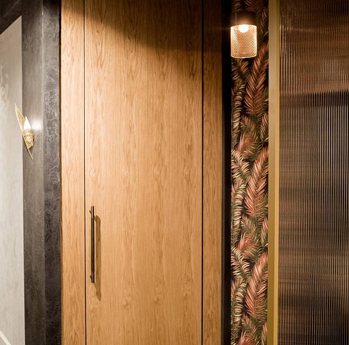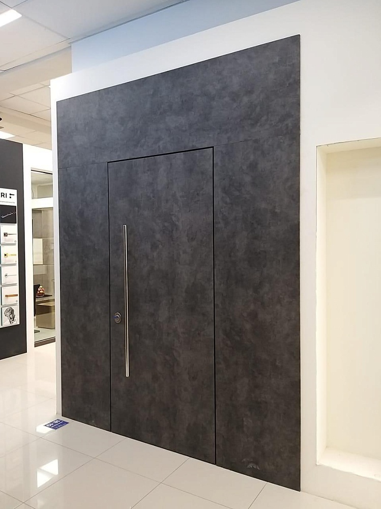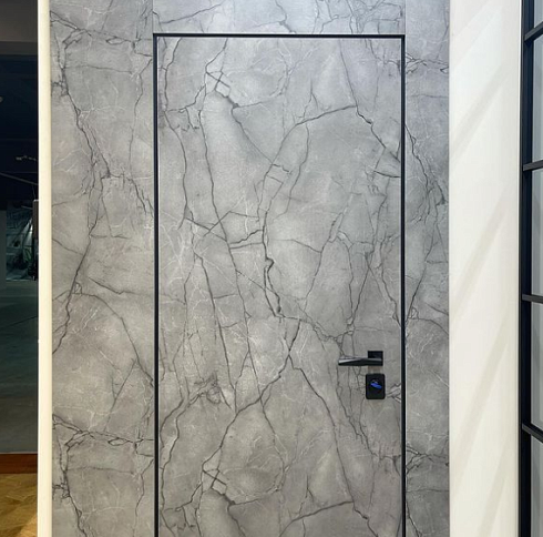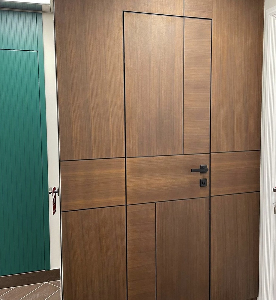 Современно и эстетично. Добавить графичности или сделать акцент именно на скрытой двери помогут современные отделки, например, шпонированные панели или оформление антивандальным материалом с имитацией природного камня. Бонус - возможность изменения облика в соответствии с новыми требованиями интерьера.