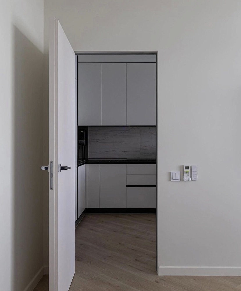 Лёгкость и изящество в каждой детали. Скрытые двери со стеклом разгружают интерьер, способствуют
