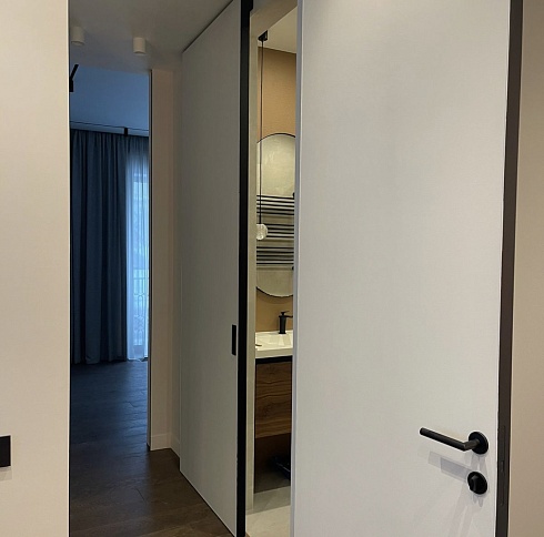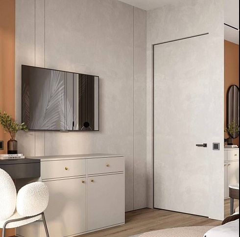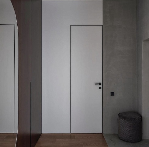 Дверь, которая растворится в дизайнерском пространстве. Универсальное решение - гладкое полотно со срытым коробом, обработанное белым грунтом.